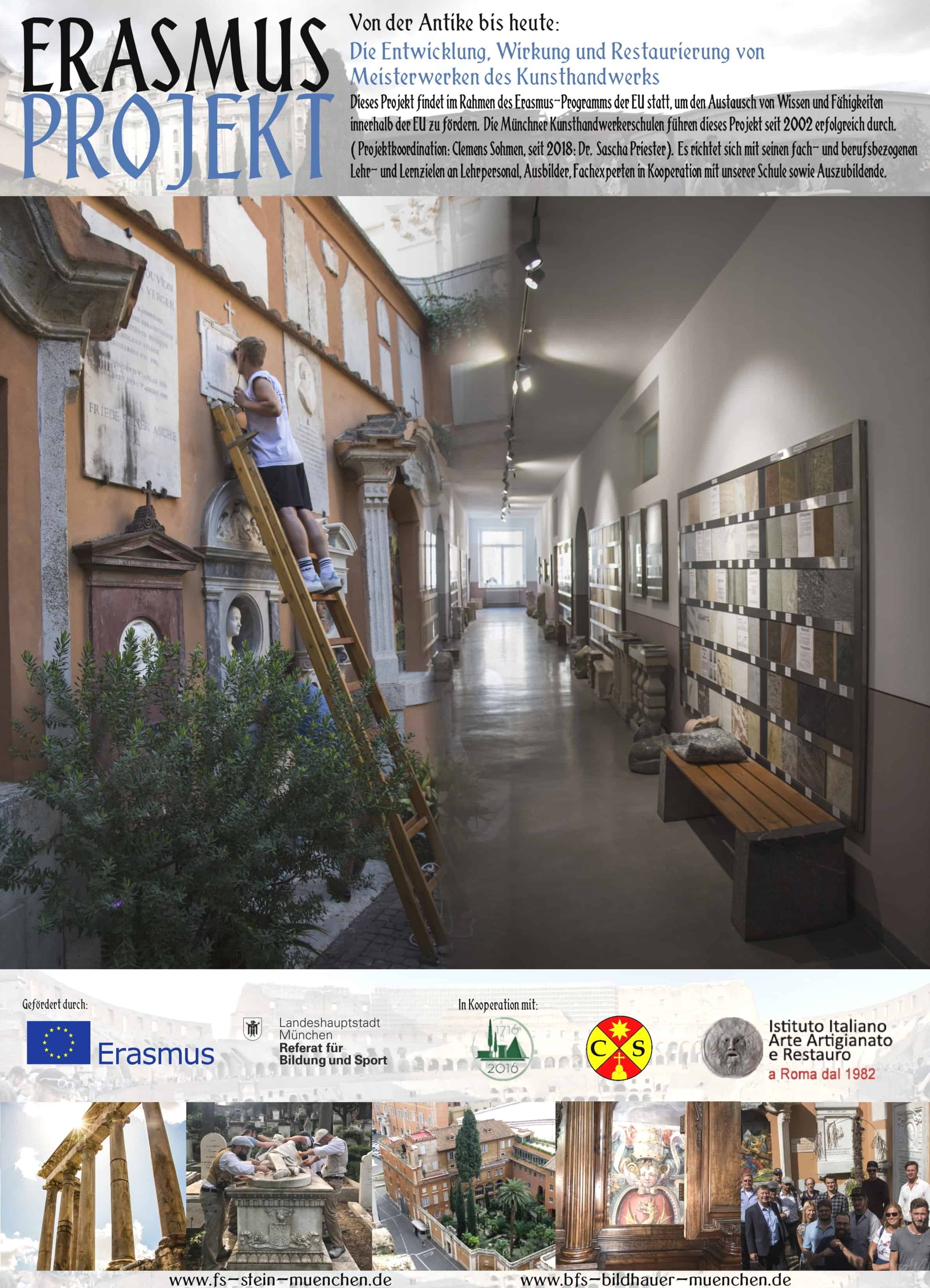 Im Rahmen unseres laufenden Erasmus+-Projektes in Rom („Meisterwerke des Kunsthandwerks“) findet im Schuljahr 2020/21 eine Vortragsreihe statt. Sie dient der Vertiefung und Erweiterung unseres Unterrichts und richtet sich an die teilnehmenden Schülerinnen und Schülern aus den Bereichen Holz und Stein. Je nach Corona-Situation finden diese Veranstaltungen, die von Lehrpersonal, Ausbilder*innen und externen Experten begleitet und auch als Gesprächsrunden gestaltet werden, im Präsenzunterricht oder als Online-Unterricht regelmäßig statt. Von Ausbildern, Auszubildenden sowie auch den italienischen Partnereinrichtungen gemeinsam erarbeitet und aufeinander abgestimmt, bilden diese Themen dann während der Projektphase vor Ort in Rom bei ausgewählten Besichtigungen wie auch bei der praktischen Restaurierungsarbeit Schwerpunkte unseres Programms. Diese theoretische wie praxisorientierte Projektarbeit führt zu einer beruflichen Fortbildung und Weiterqualifizierung aller Beteiligten, indem wir von- und miteinander lernen und zusammen arbeiten.